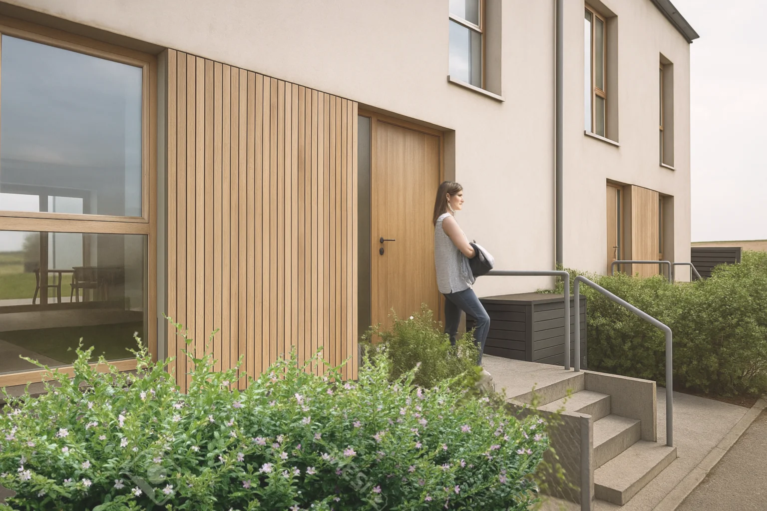 - Les façades alternent enduits et bardages, offrant une singularité extérieure propre à chaque maison